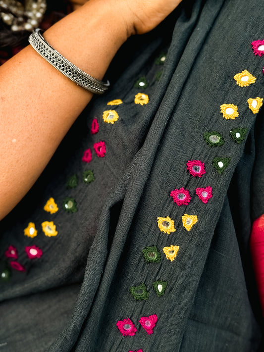A black saree with a colorful border and a golden blouse will make an elegant statement while a black saree with a sequined blouse and a sheer dupatta can be perfect for a special event.