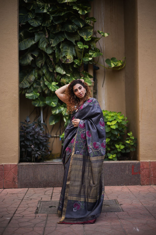 Grey Black Kosa Silk with Kantha Stitch
