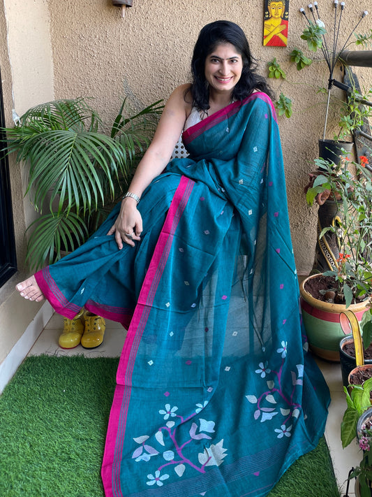 Sold outTeal Blue Jamdani cotton saree