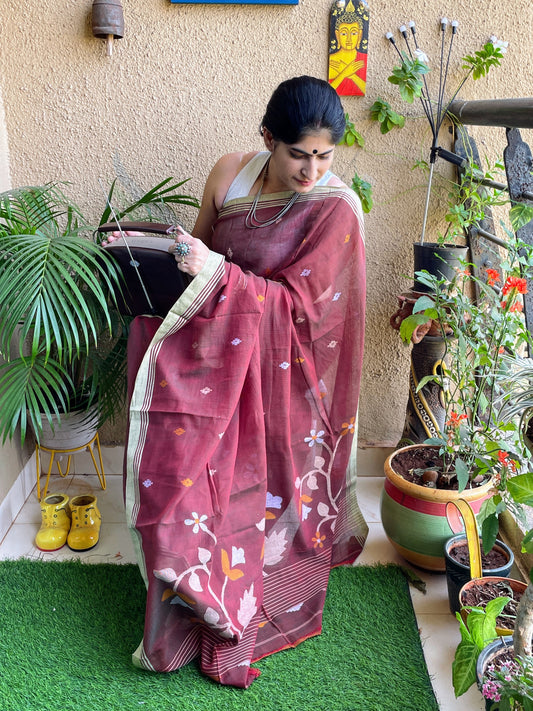 White pink Jamdani cotton saree