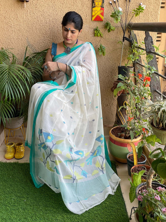 White Jamdani cotton saree with green