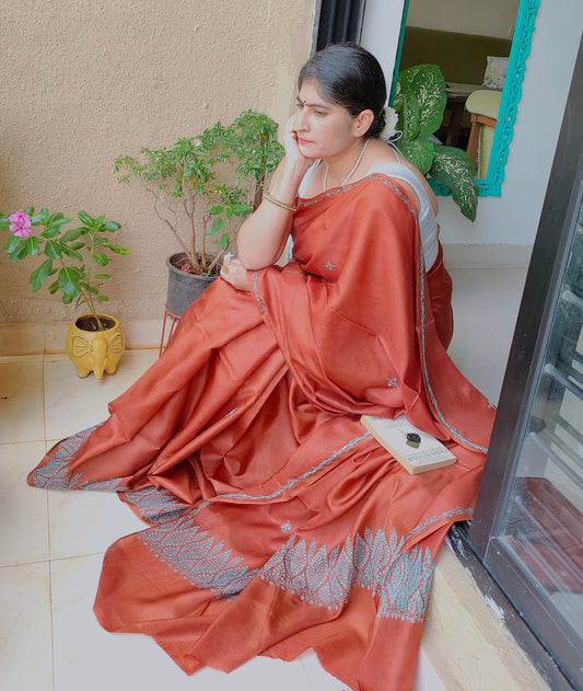 Maroon Silk Sozni Saree from Kashmir