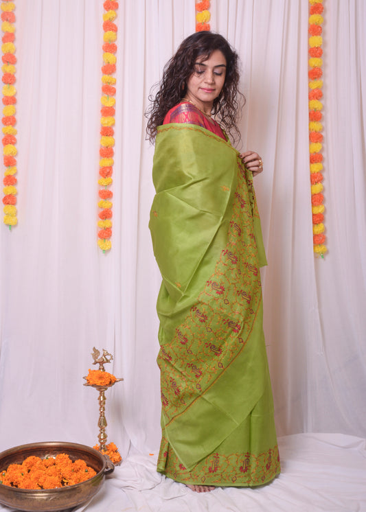 Green Silk Sozni Saree from Kashmir