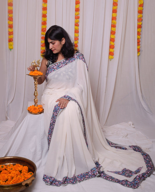 Pre booking Ivory white Aari work kashmiri saree