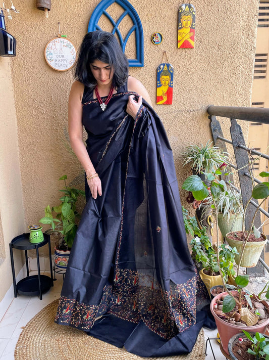 Black Sozni kashmiri saree in mulberry silk