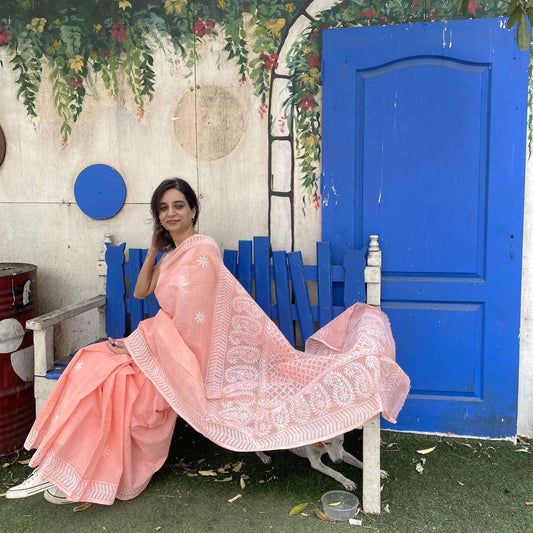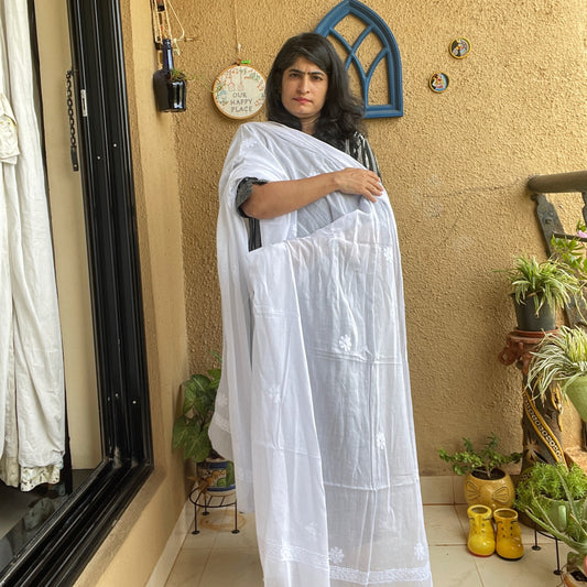 Chikankari Cotton Sarees are made of cotton fabric with Chikankari embroidery. The embroidery on these sarees is delicate, subtle, and intricate, usually white on pastel colors. Sarees are traditionally embroidered by hand and can take several weeks to complete.