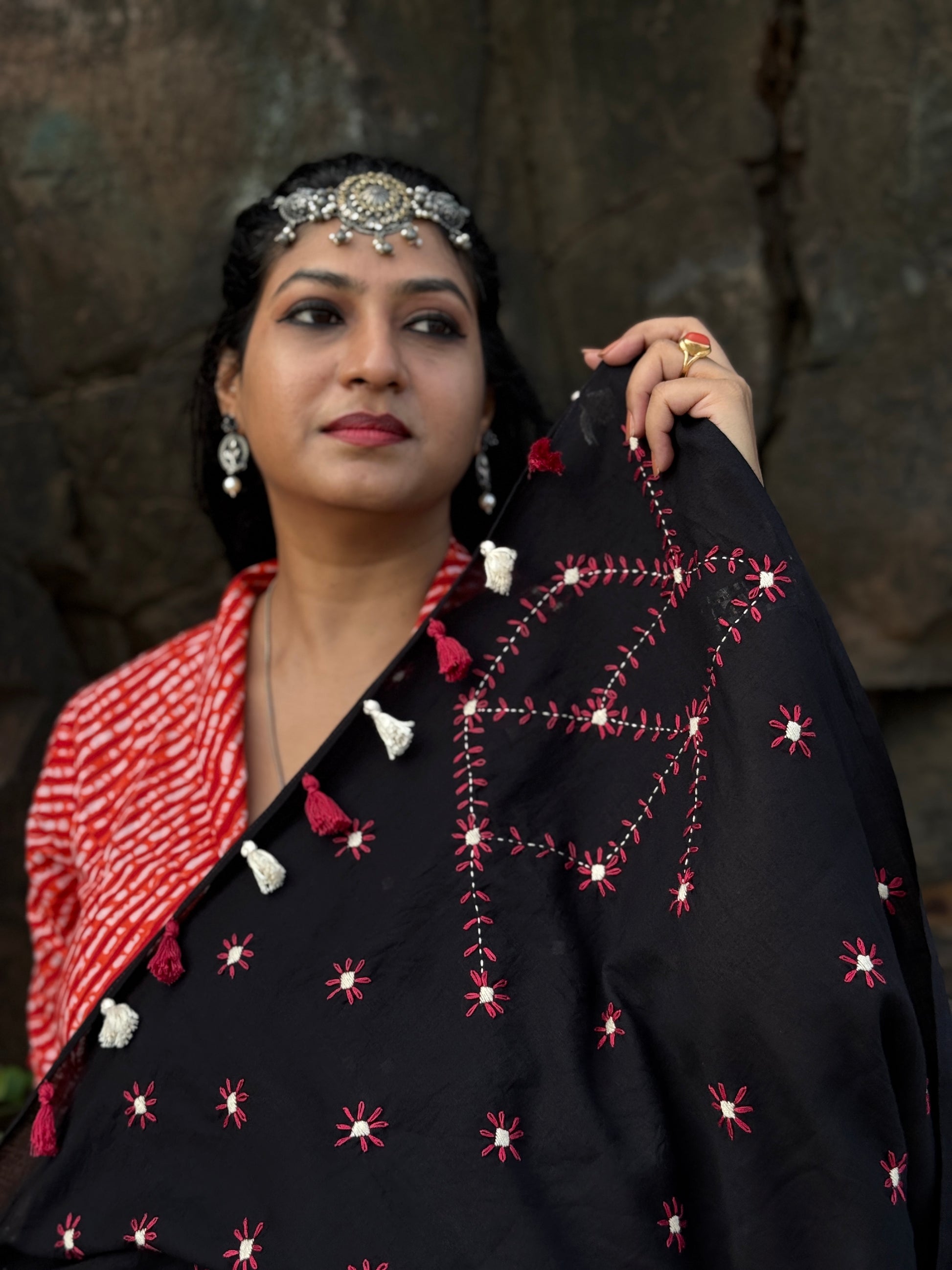 Handwoven soft cotton saree in black with intricate Rajasthani Embroidery motifs all across the body and a heavy pallu. The saree has a floral pattern with embroidered patterns in colorful combination of threads. This saree is made by women artisans from Bikaner.