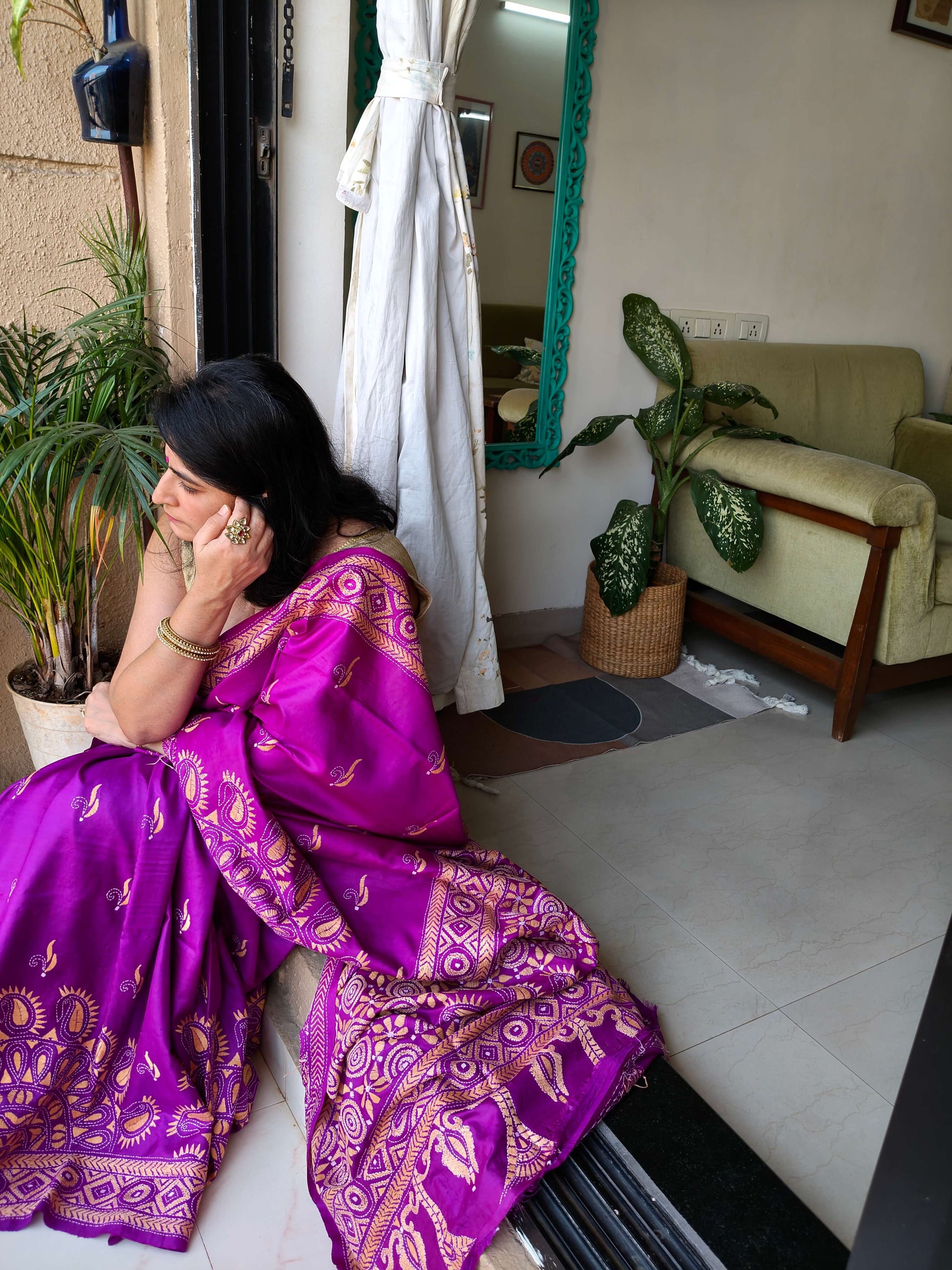 Pure Silk saree is a celebration of artistry and purpose. Featuring intricate hand-stitched Kantha embroidery crafted by talented women artisans from villages near Shanti Niketan, it's more than just a garment—it's a statement. Draped in luxurious silk, this beauty is your go-to for weddings, festivals, and unforgettable moments. Every thread represents skill, tradition, and the empowerment of the women who create it. Wear it with pride and let the craftsmanship speak volumes.