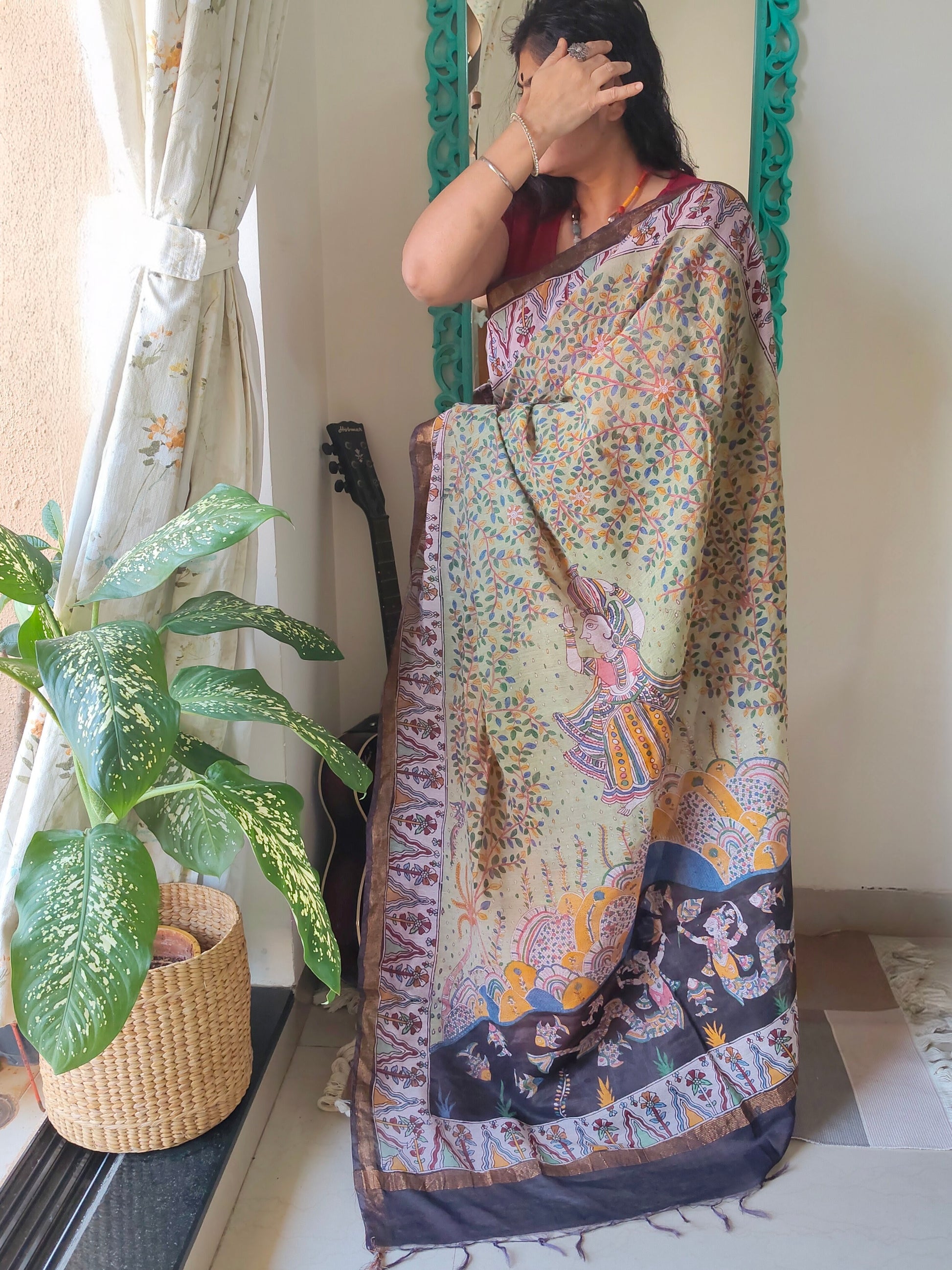 Discover the timeless artistry of Mata Ni Pachedi in this exquisite hand-painted saree. Each piece showcases the intricate devotional craft tradition, featuring vibrant goddess imagery and ornamental patterns meticulously created by skilled artisans. The flowing fabric drapes beautifully while celebrating centuries-old Gujarati heritage. Perfect for festive occasions, cultural celebrations, or anyone seeking authentic, wearable art. Own a saree that tells a story of craftsmanship, spirituality, and unparalleled elegance.