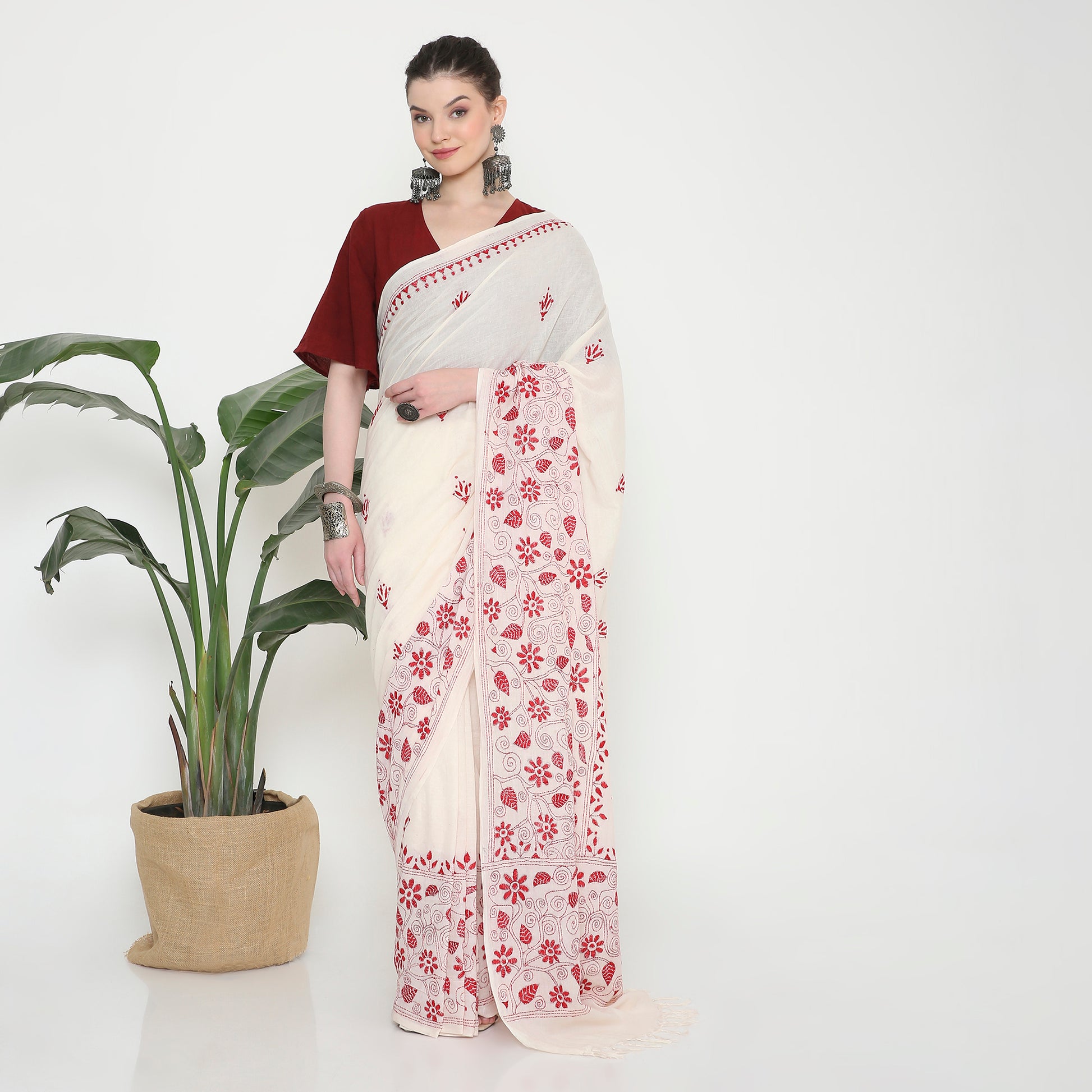 Experience the elegance of our Mul cotton saree, delicately hand-embroidered with traditional Kantha stitches. Crafted from soft, breathable cotton, it’s ideal for casual outings and special events alike. Each saree showcases the skilled handiwork of women artisans from villages near Shanti Niketan, reflecting our commitment to empowering these talented creators. Embrace timeless beauty and support a meaningful cause with this exquisite saree.