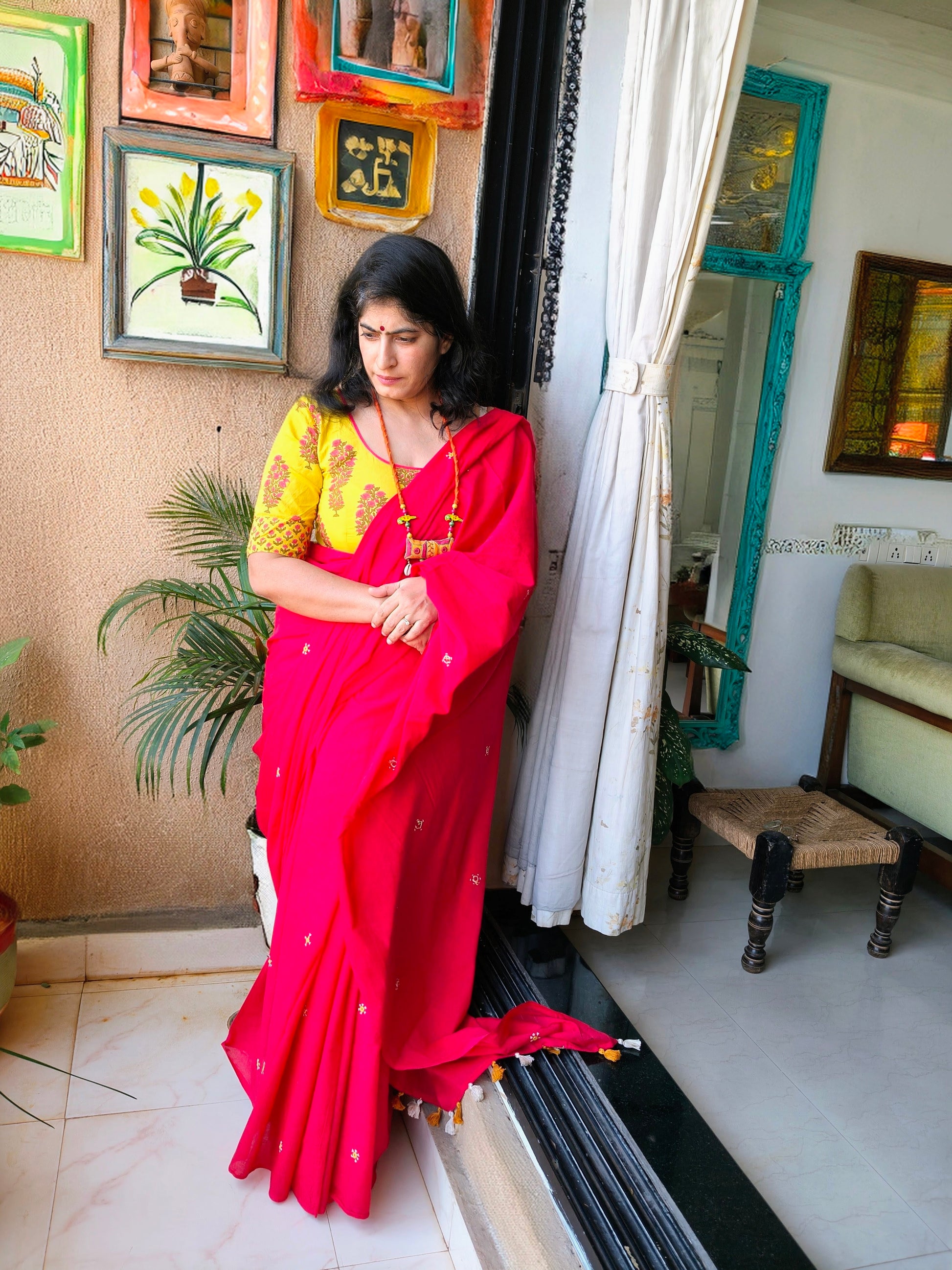 Handloom Mul cotton Saree in red with minimal embroidery and mirror work