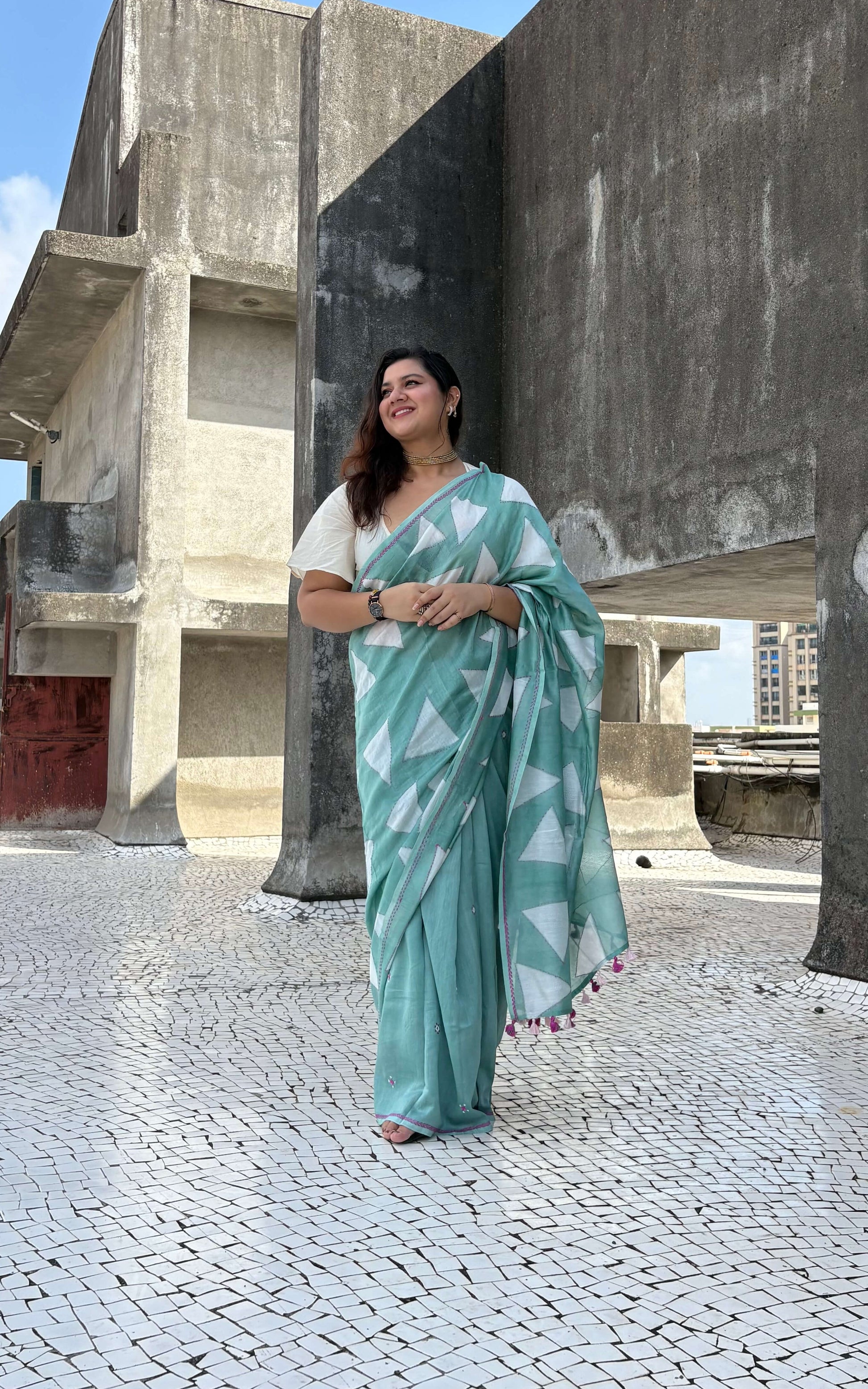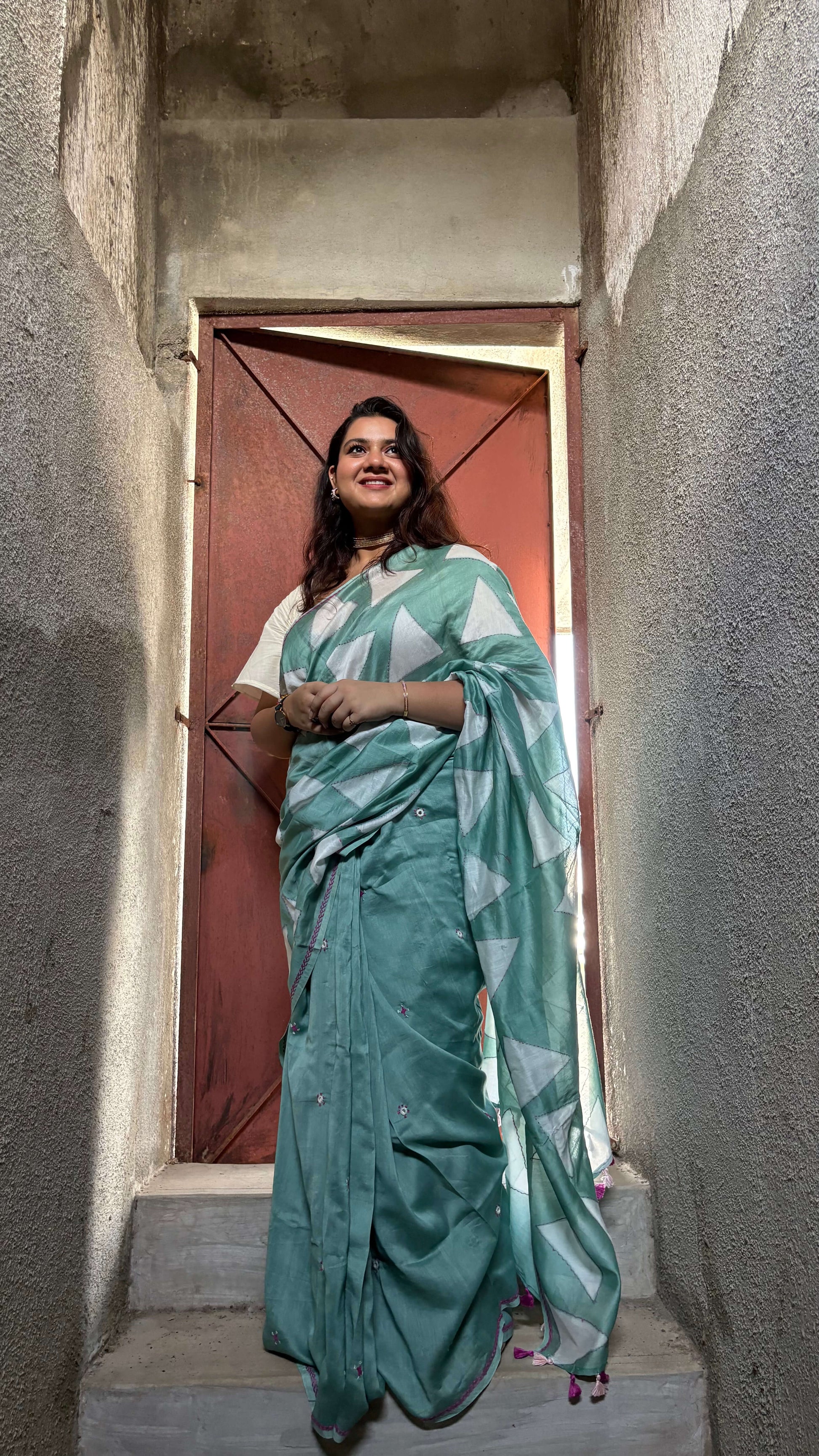 Chanderi Saree in half and half pattern with geometric pattern made using clamp dyeing technique. Hand embroidery to accentuate the clamp dyeing