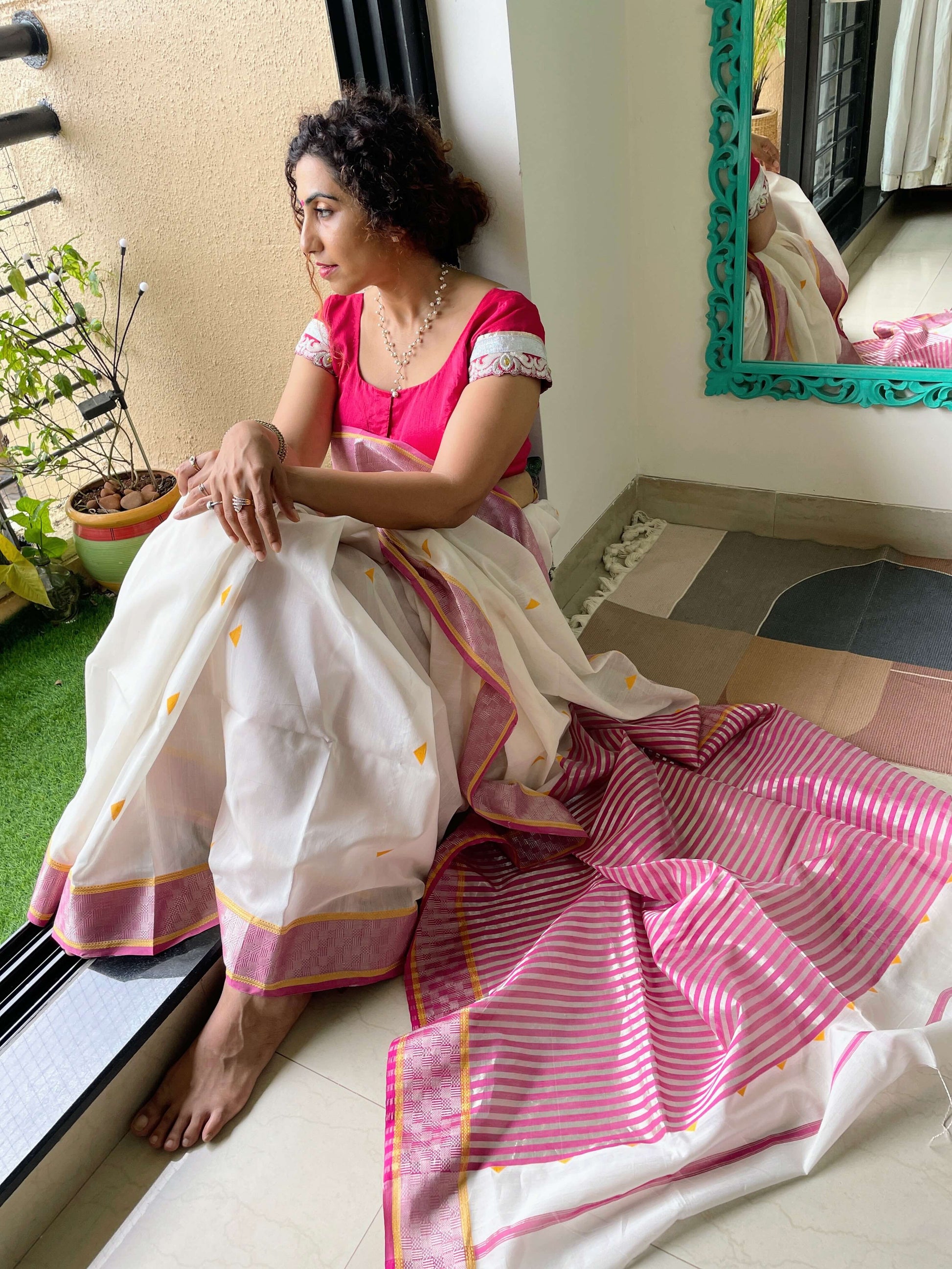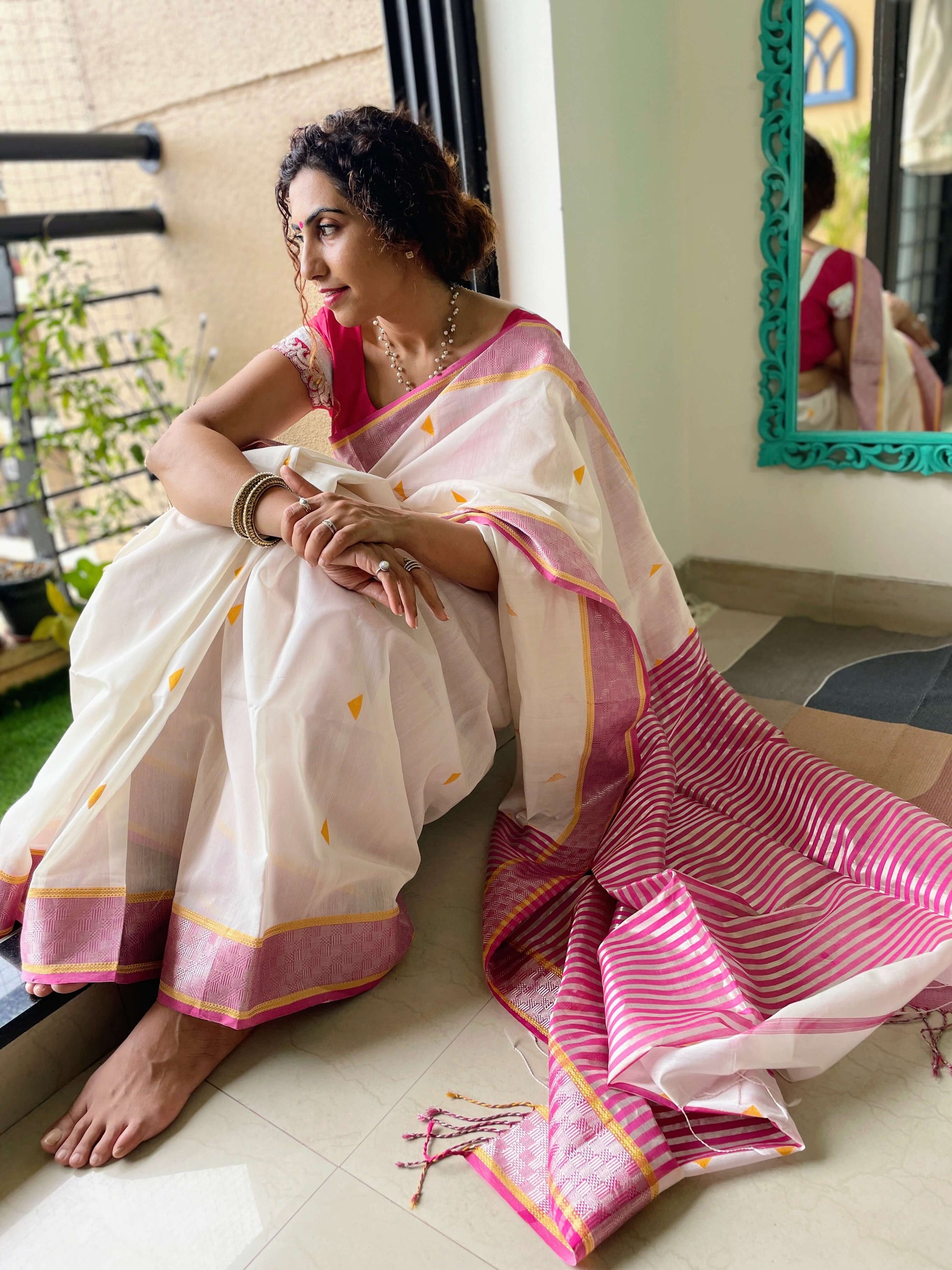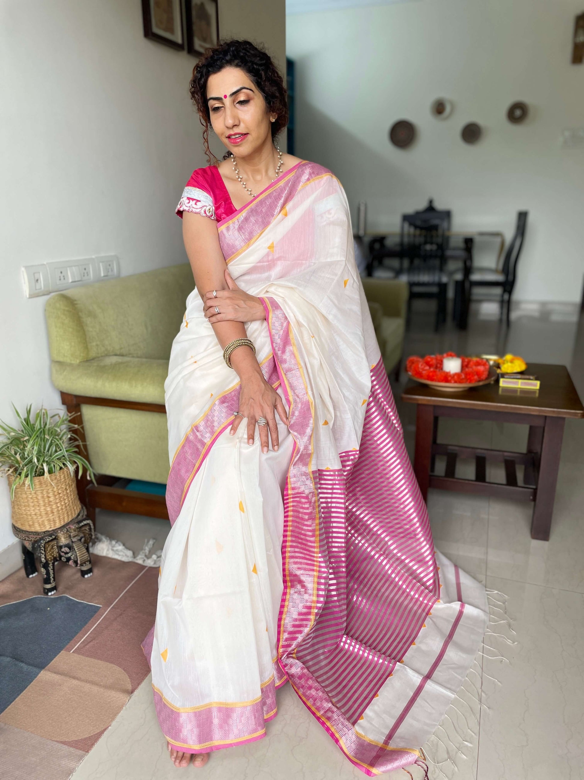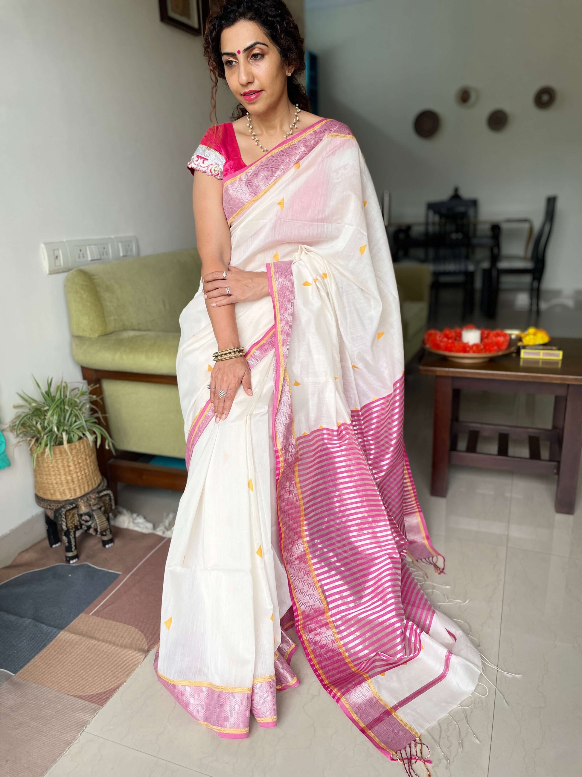 Saree comes with a broad pink border and a striped pink and silver Pallu .